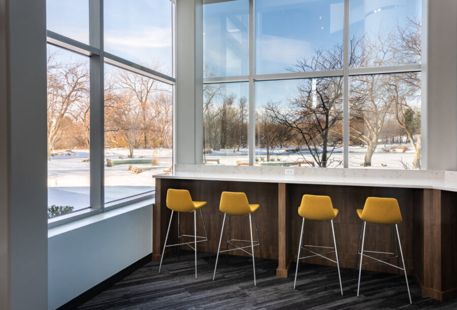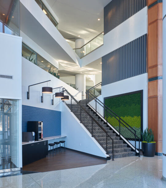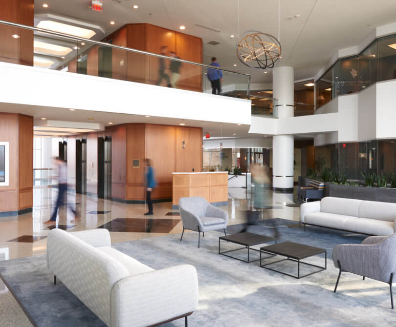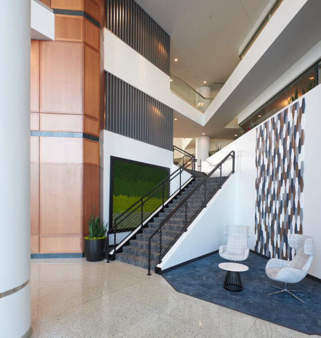 When 505 Waterford was acquired by the owner of its sister building, 605 Waterford, BDH was selected to rejuvenate the public areas to align with current workplace trends and behaviors. The outdated lobbies were transformed into amenity areas providing numerous opportunities for collaboration and flexibility, while also connecting users to an abundance of natural light and green space. Encompassing a multitude of seating options, the lobby areas accommodate a variety of work styles and offer respite from the office suites. Covered in heavily-patterned terrazzo original to the 1987 building, BDH found creative ways to highlight fresh materials and create a refined aesthetic appropriate for the class A suburban office building. The renovation of the public areas not only elevates the look and feel of the common areas, but the updates empower the 505 and 605 buildings to function as a unified office park.