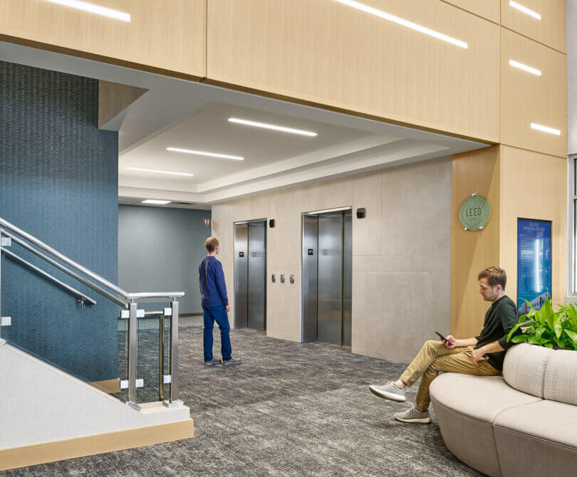 Blaine Medical Center hadn’t been updated since it was originally constructed nearly 20 years ago. BDH elevated the interior aesthetic by balancing warm wood tones with cool, earthy colors, adding decorative lighting, and placing versatile furniture in the epicenter of the common area. Additionally, natural greenery was thoughtfully interwoven throughout the soft seating, enhancing both comfort and visual appeal. By strategically relocating and opening up the stairs, their visibility improved significantly, encouraging patients to choose the stairs over the elevator—a small change that contributes to overall wellness. The updated interior design unifies the two floors, vastly improves the patient experience, and will attract new tenants into the building for years to come.