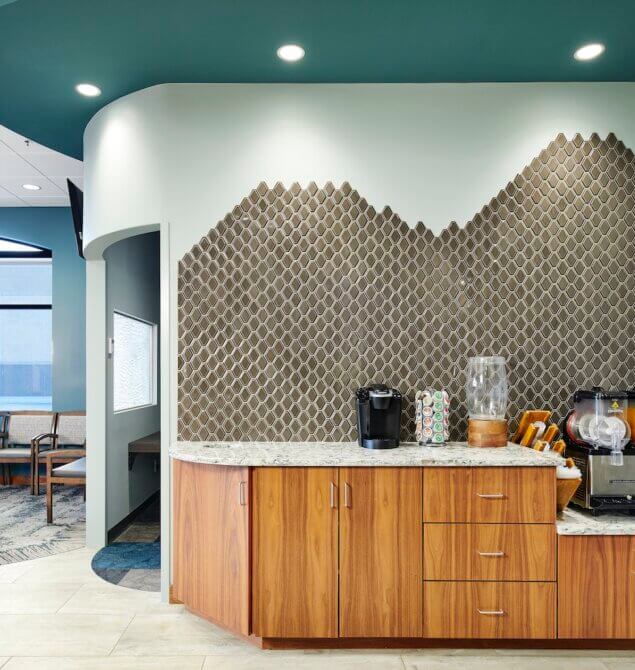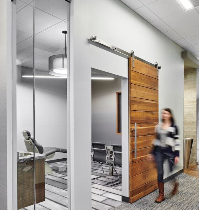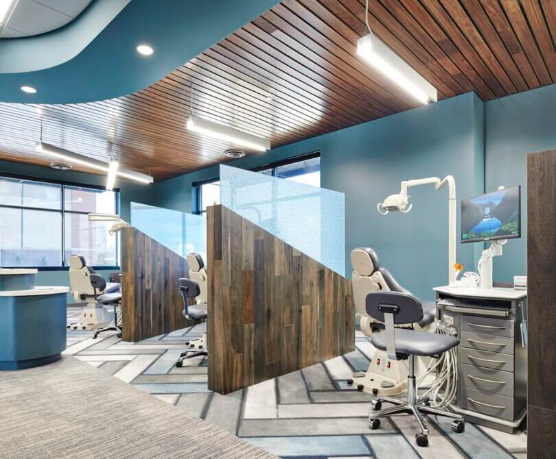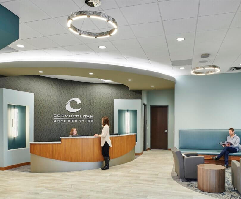 Cosmopolitan Orthodontics is a sophisticated, yet fun, orthodontic clinic appealing to children and adults alike. Resembling the spa experience, the orthodontic clinic contains warm wood tones, local materials, a coffee bar and an elegant restroom for patient use. Complete with a video game room, children remain entertained in the lobby until their appointed treatment time when they are led to an open treatment bay with high ceilings, reclaimed barn wood, a pop of color and natural light. Designed to accommodate eight treatment chairs, the layout of the clinic clearly distinguishes staff areas from patient space and allows for future expansion. Ultimately, the design of Cosmopolitan Orthodontics maximizes the patient experience, increases staff efficiencies and gives the provider a competitive edge in the Lakeville market.