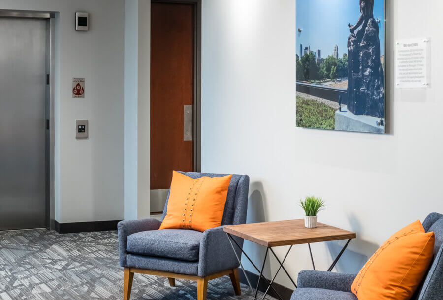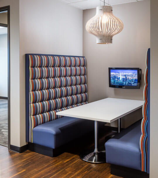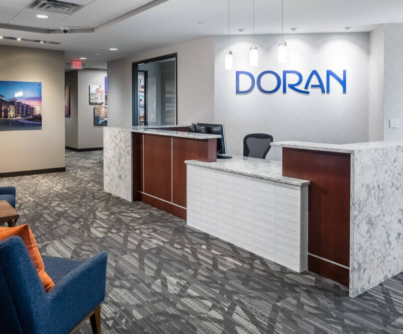 The BDH team partnered with Doran Companies for a full floor renovation of their current office allowing the Architecture and Construction departments to be consolidated onto one floor. The integration of individual lower paneled workstations, open and enclosed meeting areas, quiet rooms and a break room that doubles as a work lounge, provides employees with work space flexibility. Adjacent to the branded reception area is a gallery wall of projects and an over-sized board room with custom built-in wood benches for the entire company to perch on. The transparency of the conference rooms and private offices enable energy to flow throughout the entire office.