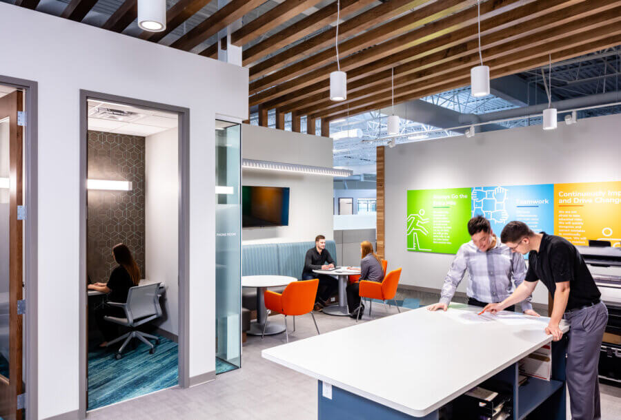 EMC experienced so much organizational growth, they no longer fit in their former office. When designing their new 40,000-square-foot office in Plymouth, we focused on positioning team members in proximate areas to increase efficiency and productivity, incorporating diversified lighting elements to showcase EMC’s products, and creating collaborative space for constructive teaming. Natural light pours through 27 skylights, wood trellises are incorporated in various areas of the space and the collaboration areas feature high-tech lighting and audiovisual components. Parallel to the company’s brand, the EMC office reverberates energy efficiency, teamwork and innovation.