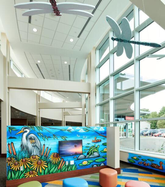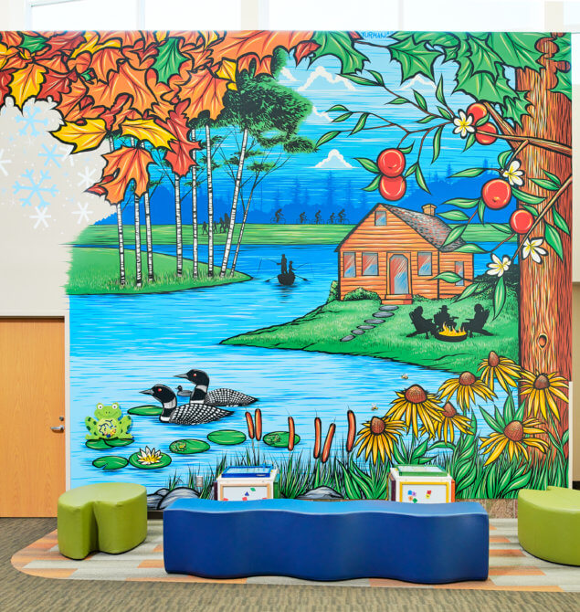 The play areas divert the children’s attention from their ailments to their imagination. As children hop on the ground like frogs they quickly forget about their aches and pains and enter a place of comfort and playfulness. They are exhilarated with creativity as they crawl in and out of the miniature cabin inspired by the whimsicality of Dr. Seuss. The outdoor landscapes featured in the murals are reflective of the Minnesotan culture and resonate with the patients. The elements of nature in the murals derive an emotional connection in patients and contribute to stress reduction and pain management. Ultimately, the imaginative and creative play structures combined with the biophilic design elements truly transform the healing experience of the patients receiving care at M Health Fairview Lakes Medical Center.