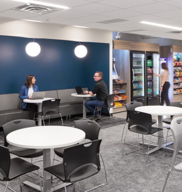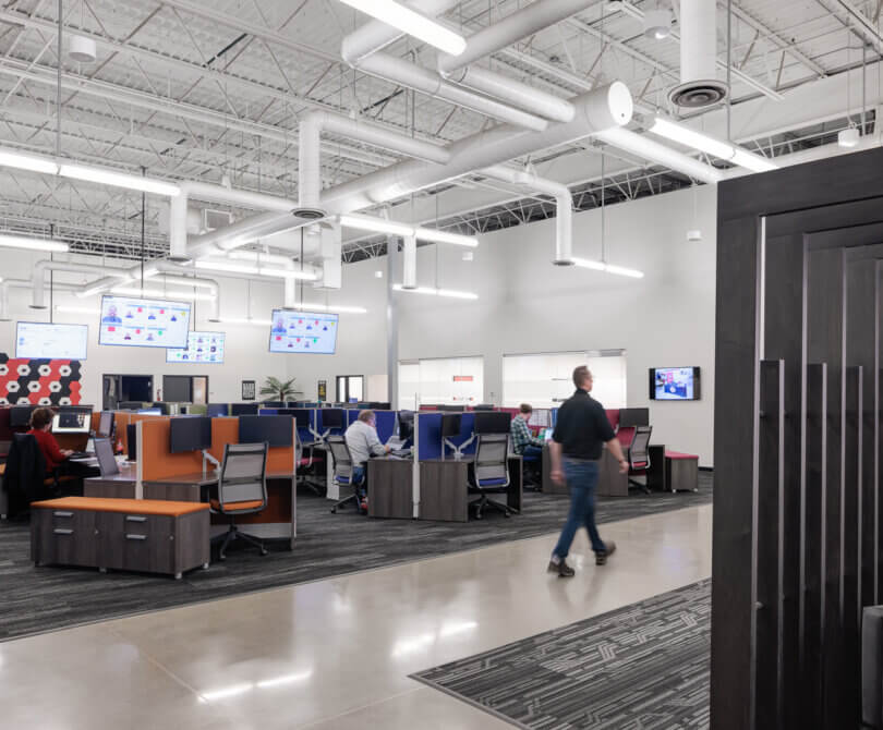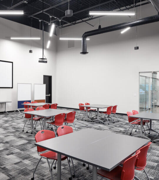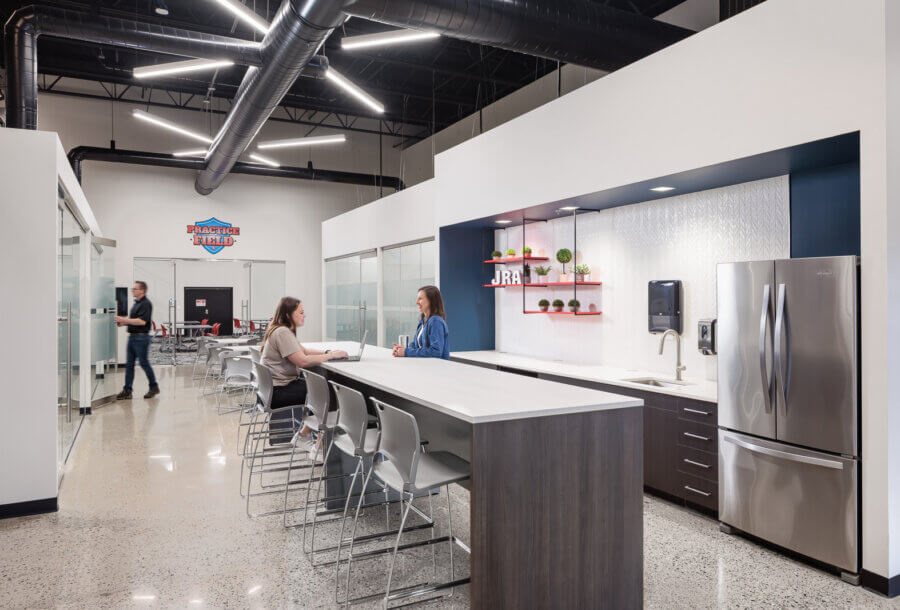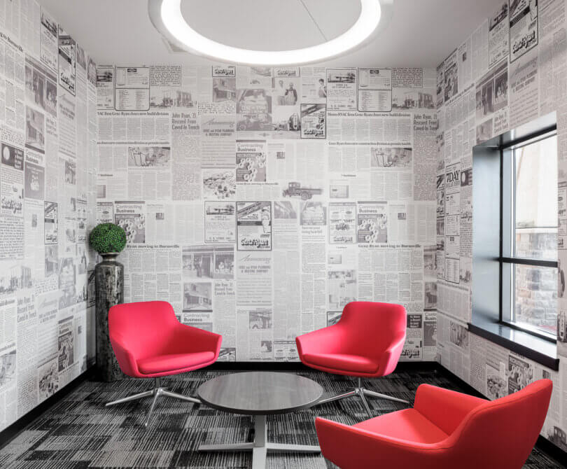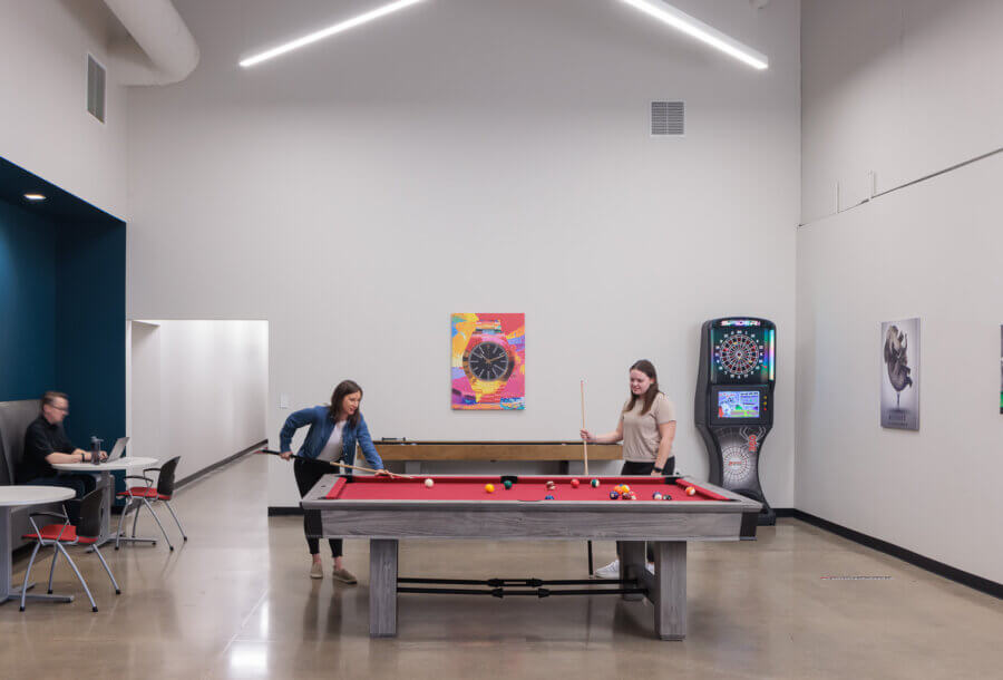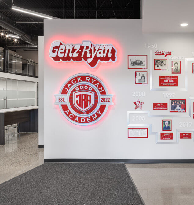 After operating out of their current building for two decades, Genz Ryan expanded into an additional 6,000 square feet and renovated their existing space. The project team aimed to design an office environment that would attract vocational students to their on-site trade school program and foster long-term commitment to the company. The new training room provides comprehensive educational opportunities for students eager to launch their careers in the HVAC industry. Essential amenities such as an elevated break room, hospitality bar, game room, and showers enhance employee well-being and contribute to recruitment and retention efforts. Additionally, a history wall showcases the family-owned company’s journey from its founding in 1950 and vibrant pops of red and blue throughout the office celebrate the unmistakable Genz Ryan brand.