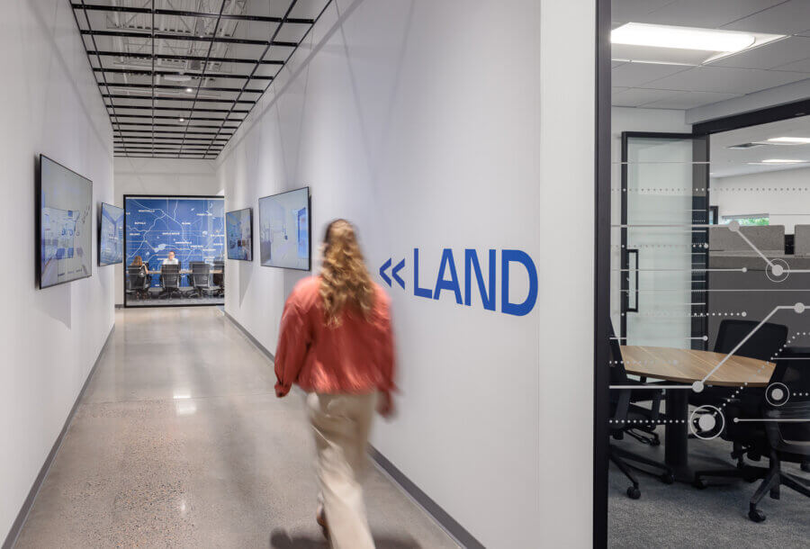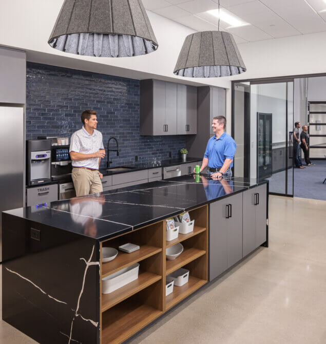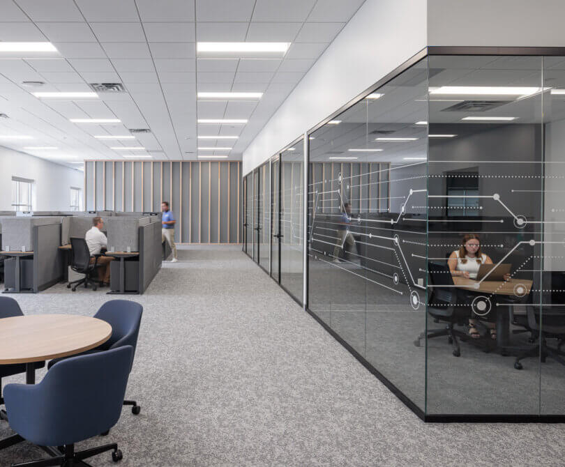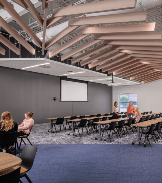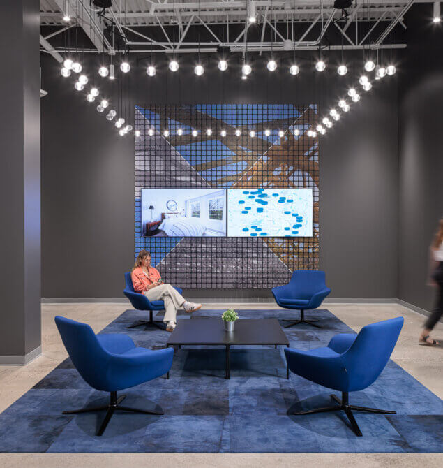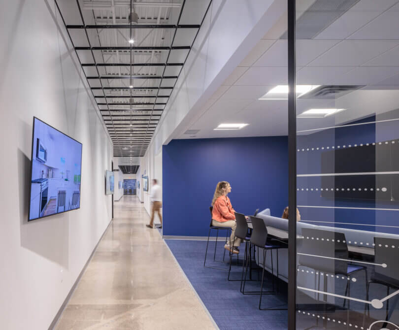 Lennar relocated to a larger building within the same campus to better accommodate their expanding needs. The project aimed to identify departmental requirements, optimize adjacencies for enhanced workflow and collaboration, and seamlessly integrate new brand standards into the built environment. The design team adapted Lennar’s corporate standards to harmonize with the building’s industrial aesthetic, incorporating decorative lighting and creatively showcasing standard images. The industrial charm of the building was celebrated by opening up ceilings in prominent areas, while the acoustic elements in the training room mirrored the roofline of Lennar homes, reflecting their core mission. Many employees transitioned from private offices to an open environment to foster collaboration, with three spacious conference rooms and additional huddle areas positioned to meet departmental needs.