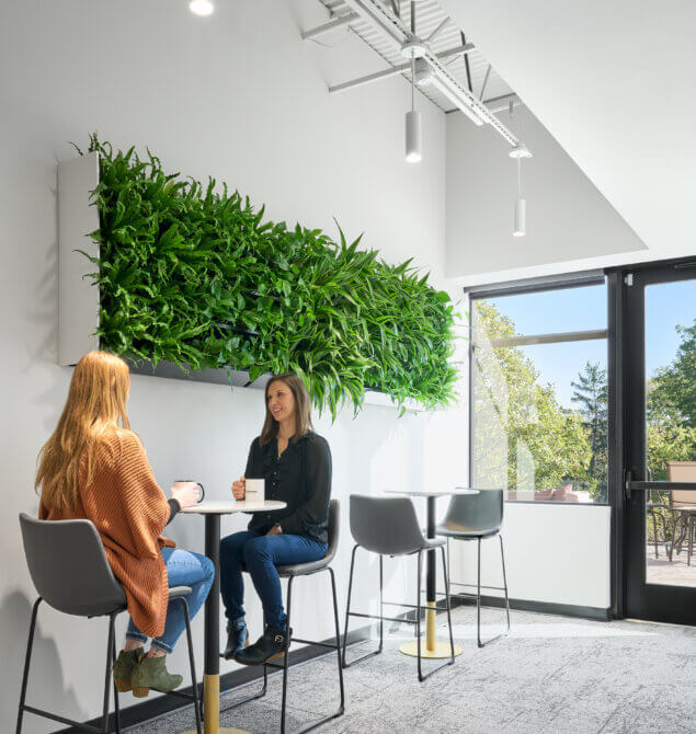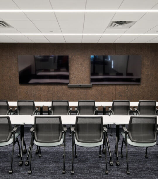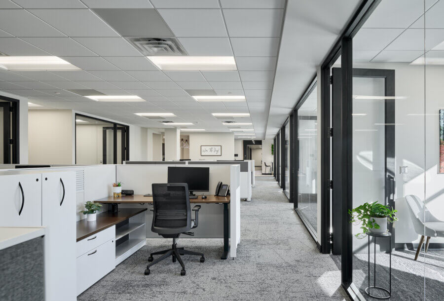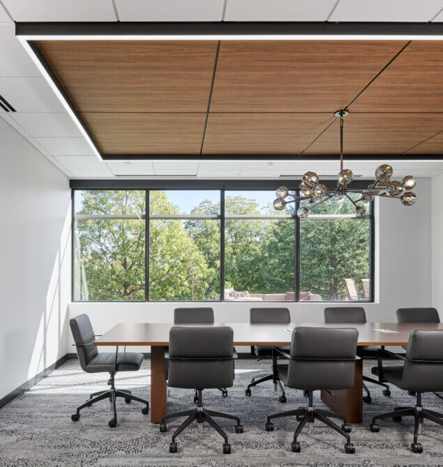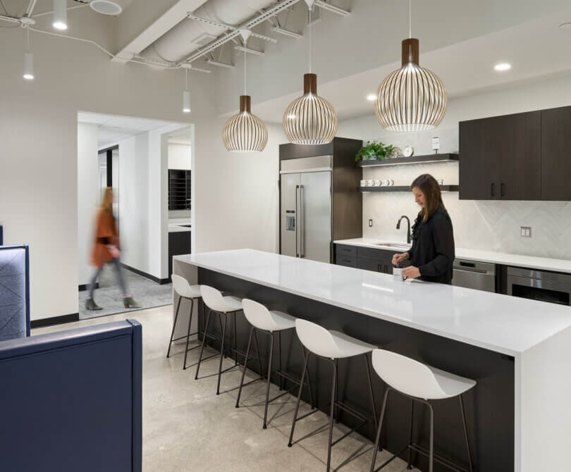 The original office space designed for the Linn Companies by BDH in 2019 proved so appealing that they leased it to a new tenant in its current state. Subsequently, the Linn Companies relocated to a vacant suite within the same building and engaged BDH once again to reimagine their office. The project aimed to achieve well-considered adjacencies, a spacious training room, and a harmonious blend of modern aesthetics with a touch of rustic charm. Thoughtfully designed private offices, a centralized break room, conference room, and lobby enhance the flow. The glass fronts on the private offices and conference rooms allow an abundance of natural light to permeate throughout the entire office. The lobby features an eye-catching wall constructed from live edge tree slabs, adding a uniquely sophisticated touch. Additionally, an exterior patio provides opportunities for respite and entertainment.