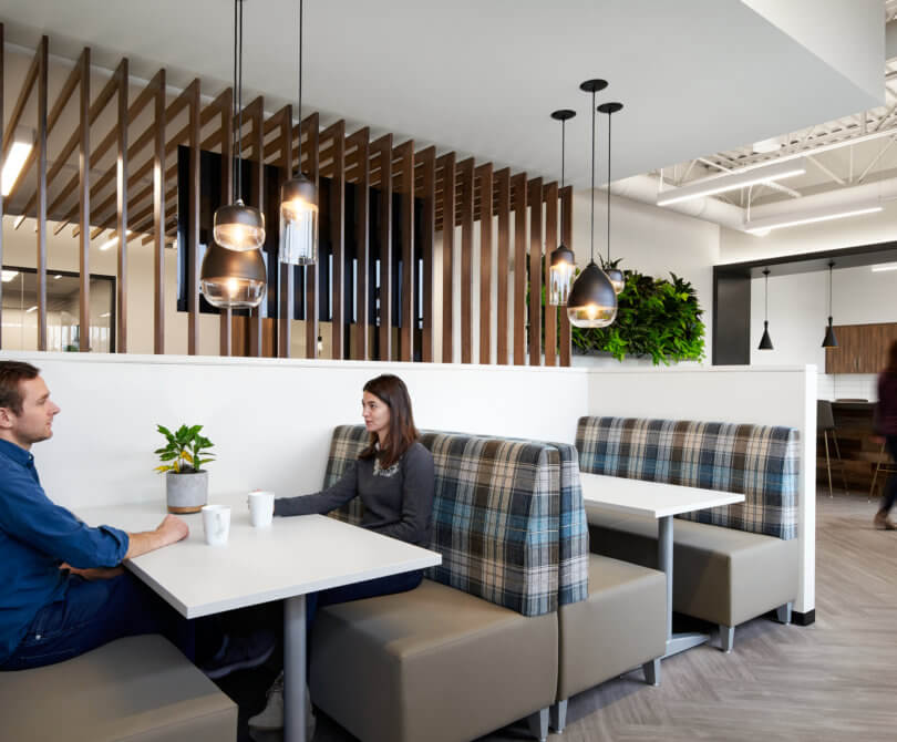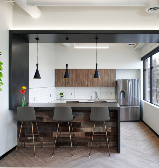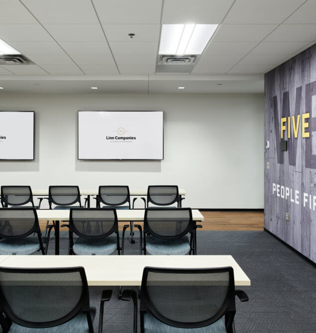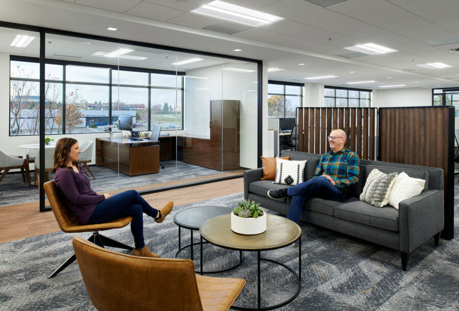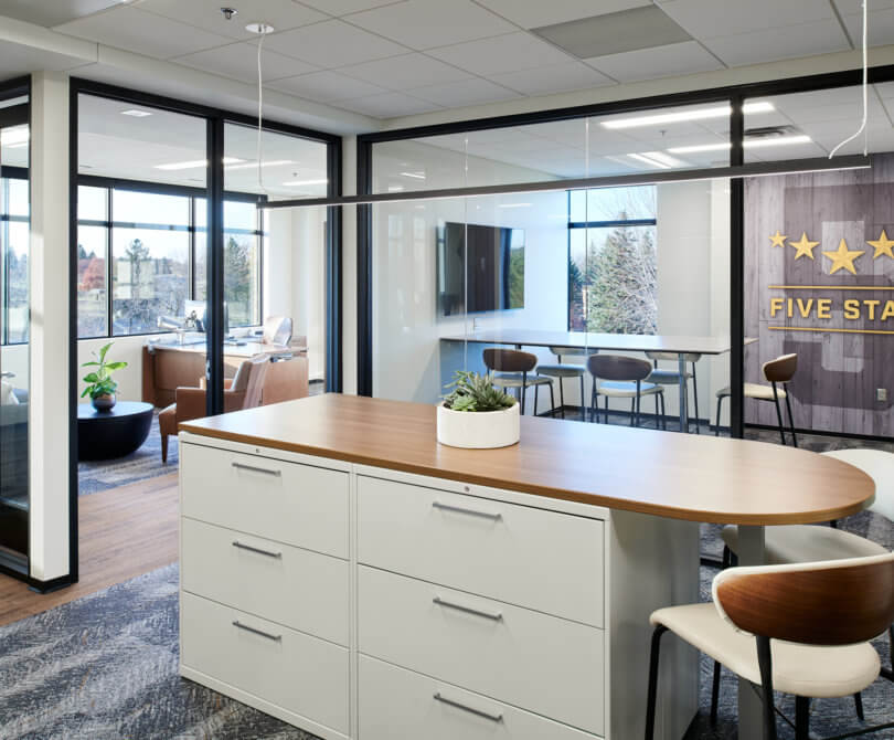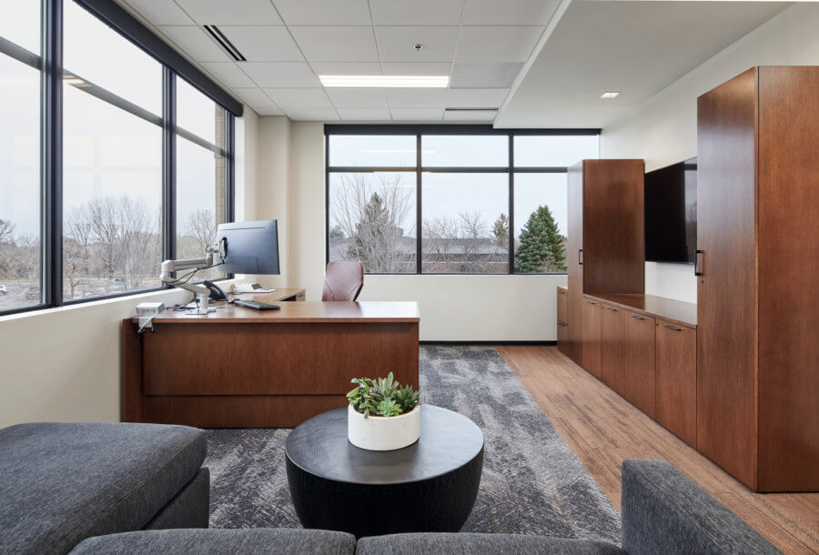 The Linn Companies recently acquired Currell Centre in Woodbury, the same building they leased office space in 15 years earlier. Designed as a spec suite used to attract tenants, the Linn Companies office conveys the unlimited potential for other suites in the business center. Upon entrance, employees and guests are introduced to the company’s modernized branding and contemporary rustic design that flows consistently throughout the 6,500-square-foot suite. Improved adjacencies enhance efficiencies among various departments, large glass windows and demountable glass walls allow natural light to seep into the open office environment, and various biophilic elements promote a healthy climate and contribute to workplace productivity. The break room, which features multiple types of seating, and the collaborative break out spaces located throughout the office create a sense of camaraderie among the staff, contributing to workplace satisfaction. The new Linn Companies office looks and feels distinctively different than when they inhabited Currell Center over a decade ago.