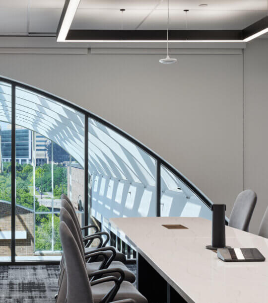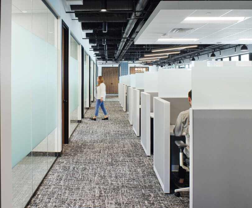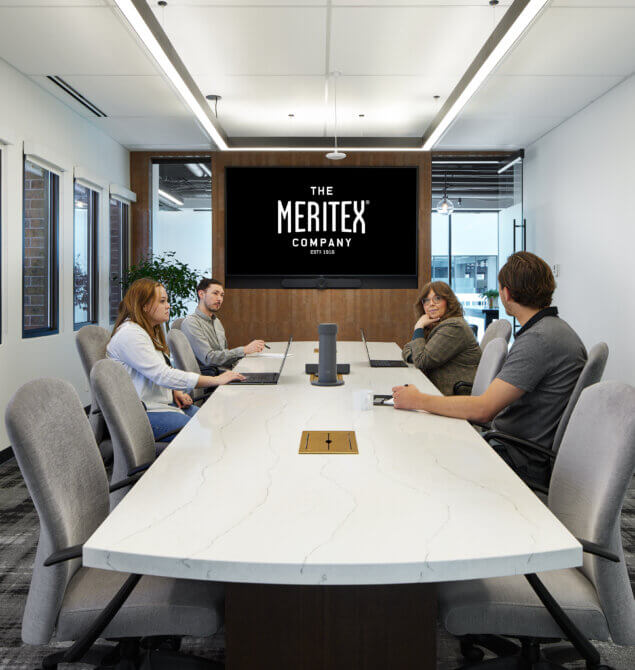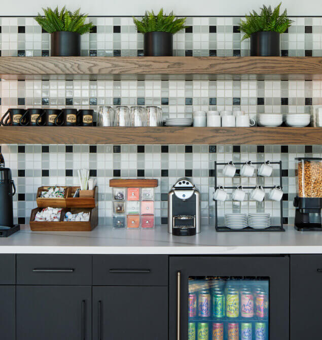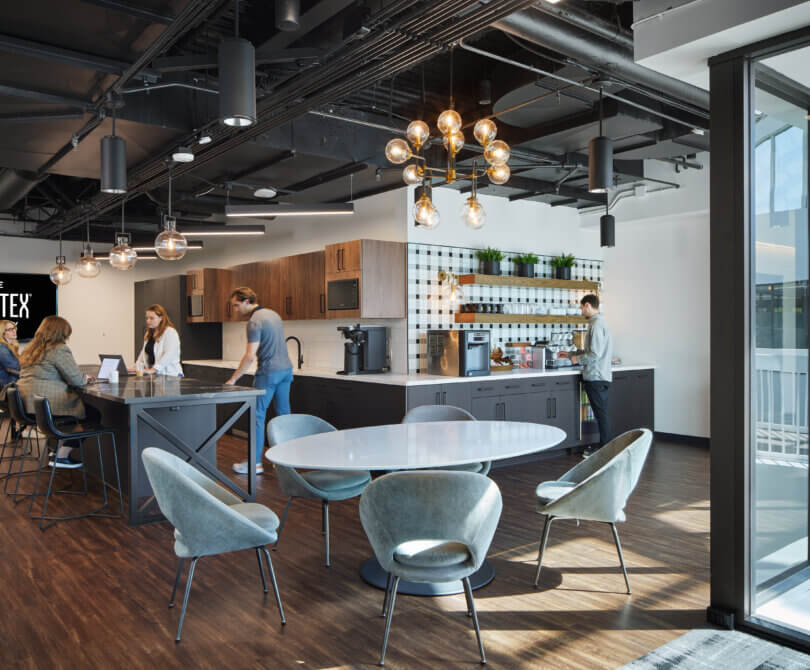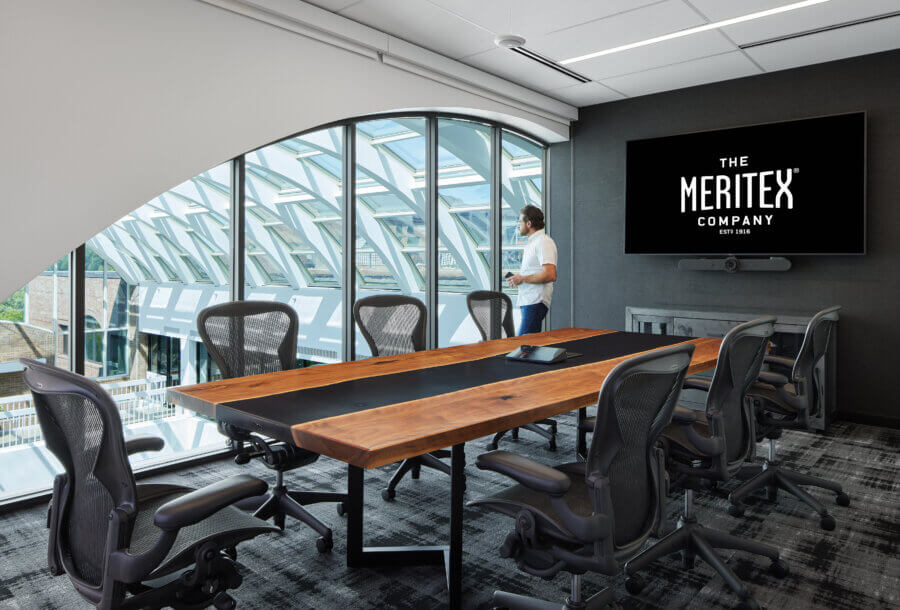 Meritex recently left The Firebarn and relocated across the street to the Studio at Riverplace. The move was driven by their growing team’s need for more space. Their project goals centered around creating a welcoming and comfortable work environment that shows appreciation for their staff and fosters retainment. Drawing inspiration from a masculine industrial design concept, the use of dark tones, plaid, leather, and wood elements pays homage to Meritex’s Minnesota roots while reinforcing their brand identity. The break room, complete with a kegerator and beverage bar, builds camaraderie, and the various meeting spaces elevate collaboration and employee engagement.