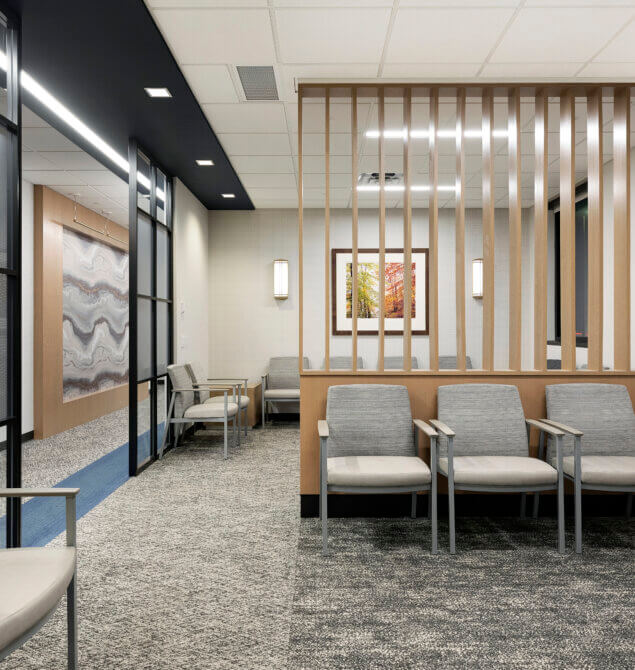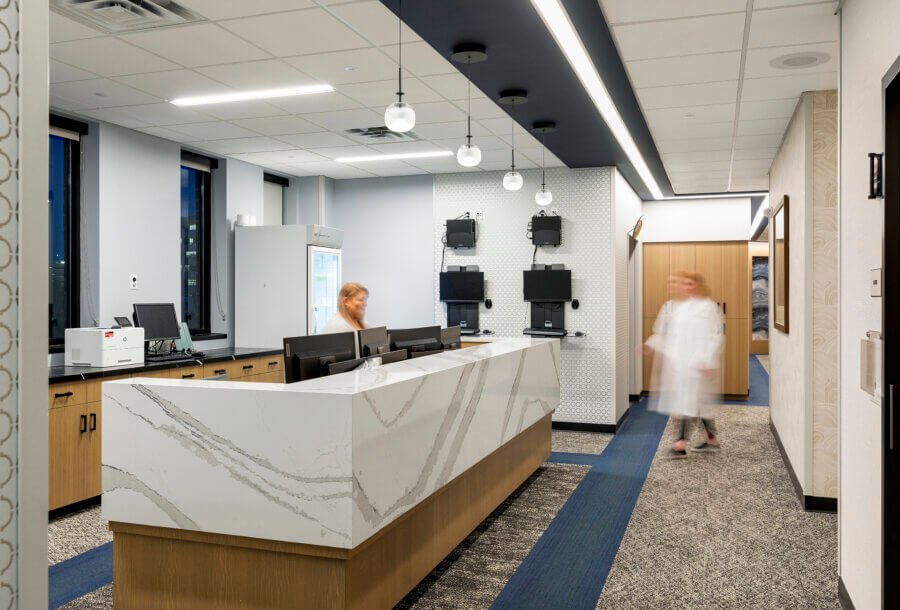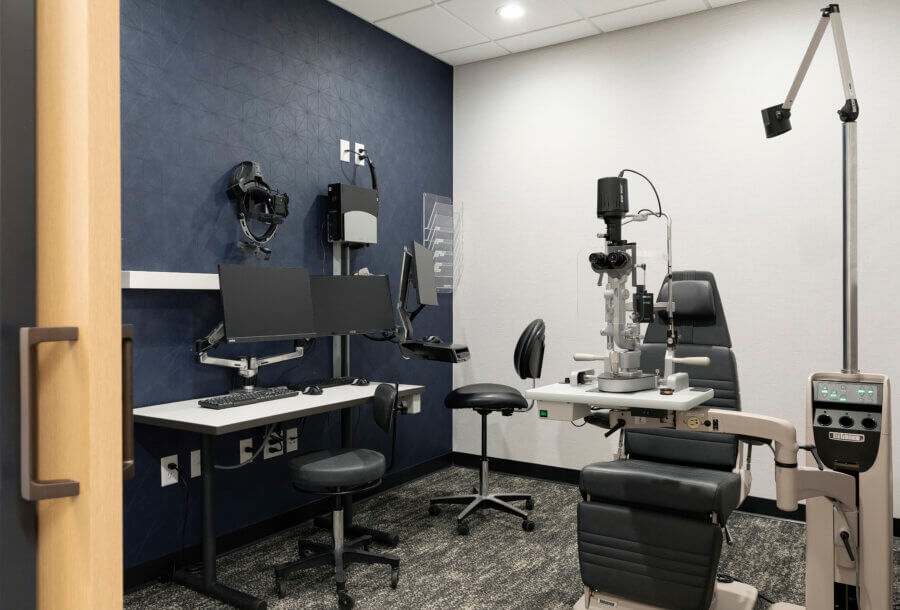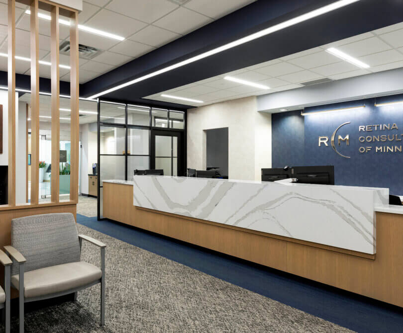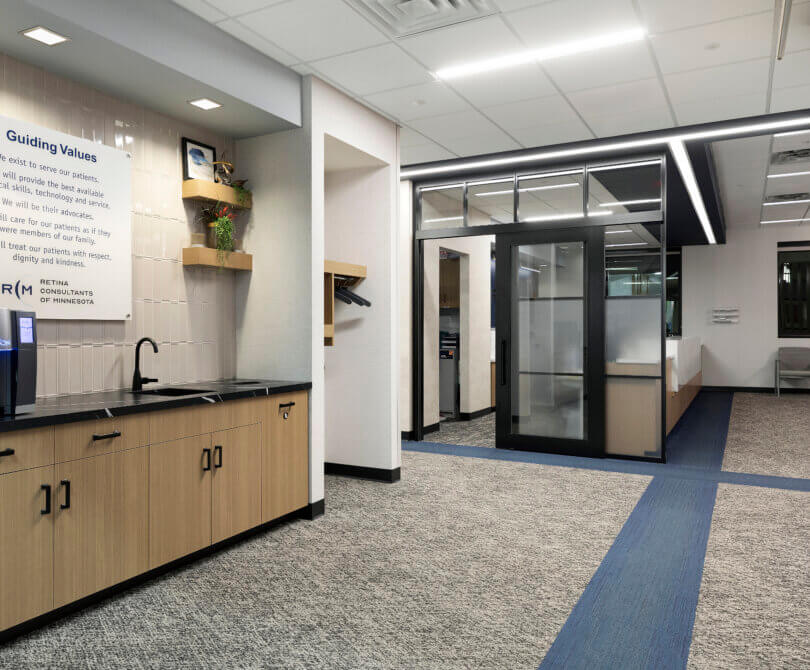 Retina Consultants of Minnesota provides advanced retinal care to area residents. The footprint of this clinic is smaller than the other clinics of the same brand. Therefore, BDH worked closely with the client to right size the exam rooms and fit all requirements within the space. The thoughtfully designed space plan accommodates two doctors, which yields a faster turnaround time with patients and generates a higher ROI. Although this clinic is 10% smaller than the Duluth clinic, both clinics contain the same amount of exam rooms, and the level of efficiency is comparable. As a result, the client is considering using the standard room sizes employed at the St. Louis Park clinic as their new standard.