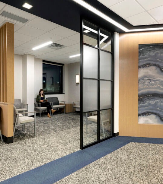 The design team was also purposeful with the finish selection, wayfinding elements, and utilization of natural light. The timeless color palette and combination of materials create a soothing environment for patients. The dark blue band of carpet and lighted ceiling feature lead patients towards the lobby and exit, which is crucial when eyesight may be compromised following procedures. It was essential to avoid windows in the exam rooms so the staff and patients benefit from the natural light at the nurses’ station, lobby, and sub-wait area.