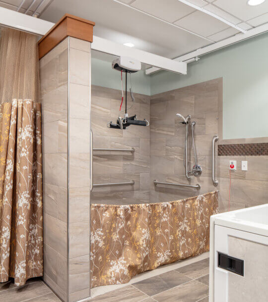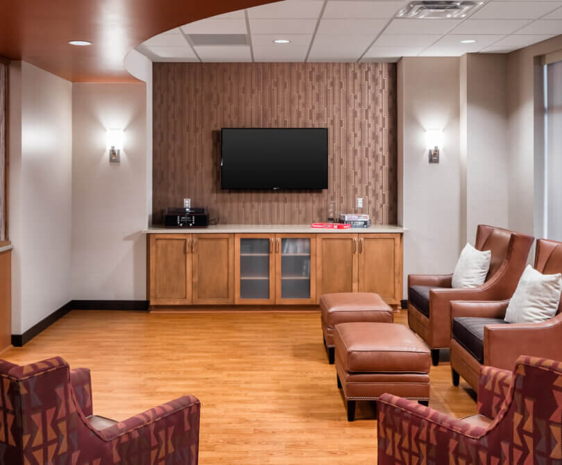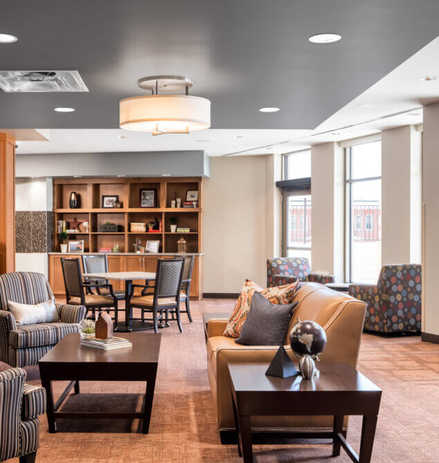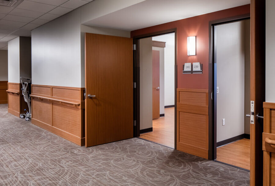 The development of Building 22 added a new, 141,800-square-foot skilled nursing residence to the Minneapolis Veterans Home campus that overlooks the Mississippi River. Minnesota veterans now have access to a modernized facility that feels more like home. The BDH designers were diligent in ensuring all aspects of design met industry standards for skilled nursing care and privacy while incorporating elements that resemble home. The five-story facility features 100 private rooms and bathrooms to make residents feel comfortable in their living quarters, as well as large open spaces for residents to gather and visit with their families.