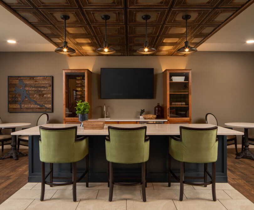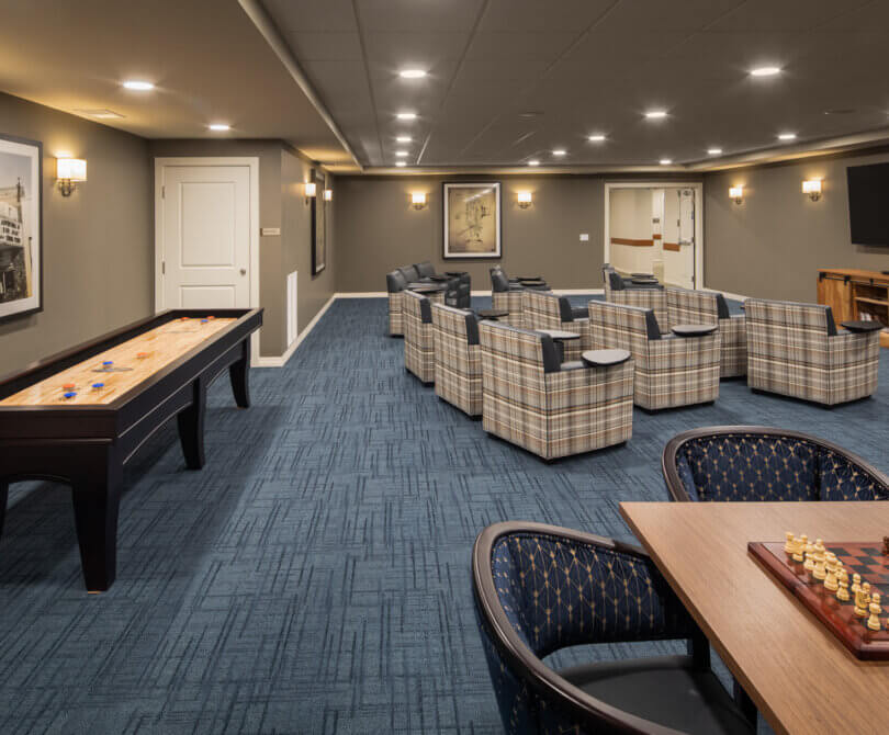On top of intentionally creating an upscale and convenient lifestyle for the residents, the employee experience was also top of mind when devising the design solutions for this project. The 650-square-foot employee lounge features a kitchenette, a mothers’ room, and multiple seating options to give the staff an area to decompress and recharge. The staff also have dedicated showers, which promotes utilization of the on-site fitness center and enables them to freshen up prior to returning home to their families.